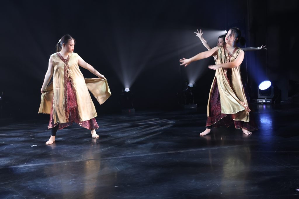 But perhaps this should not surprise us, as Bhumi is everything and she gives and carries everything. Bhumi is abundance and she has space for everyone, making the notion of earth a perfect one for a performance that unites dancers of diverse abilities. It is the variety, the harmonising of clearly different elements, that particularly strikes the audience watching this performance. There’s space for everyone, so why wouldn’t there be space for individuals who are different? The dancers with Down Syndrome effortlessly demonstrated their right to exist on that stage, and by extension on Earth herself. June, Jiaying, Katie and Namira shone on that stage, each particularly demonstrating a calmness, sincerity and centredness that perfectly evoked Bhumi for me.